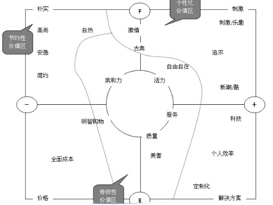 這四個象限代表了消費者價值元素的四個類別。其中: